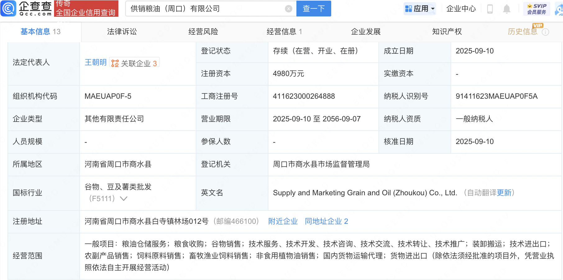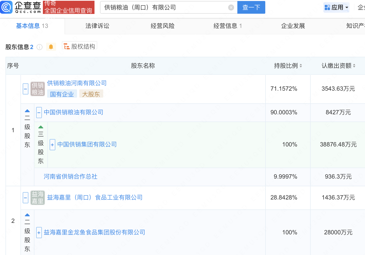 近日,供销粮油(周口)有限公司成立,注册资本4980万元,经营范围包含:农副产品销售;饲料原料销售;畜牧渔业饲料销售;非食用植物油销售等。企查查股权穿透显示,该公司由中国供销集团有限公司旗下供销粮油河南有限公司、金龙鱼(300999)全资子公司益海嘉里(周口)食品工业有限公司共同持股。