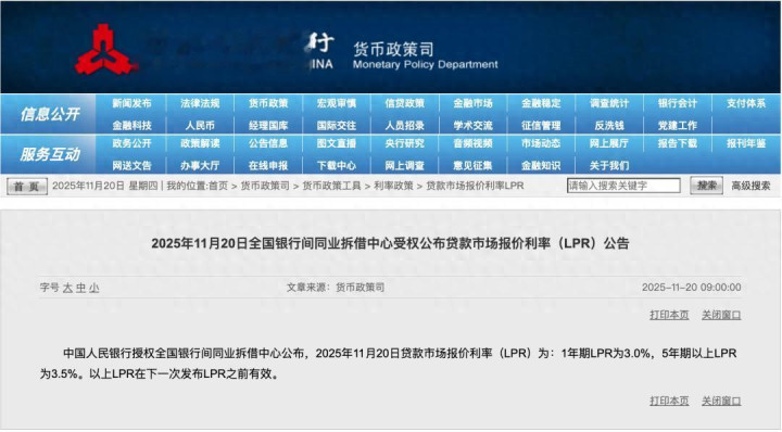 11月20日,中国人民银行授权全国银行间同业拆借中心公布,2025年11月20日贷款市场报价利率(LPR)为:1年期LPR为3.0%,5年期以上LPR为3.5%。